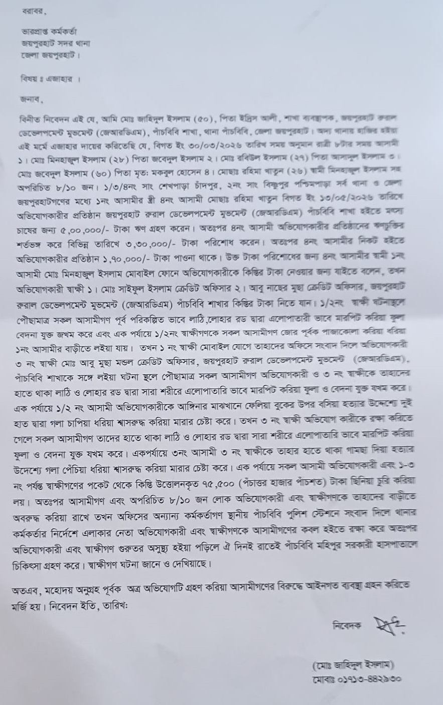 এজাহার সুত্রে জানা যায় জয়পুরহাটের স্থানীয় সংস্থা জয়পুরহাট রুরাল ডেভেলপমেন্ট মুভমেন্ট (জেআরডিএম) এর পাঁচবিবি শাখা হতে ২০২৫ ইং সালের ১৩ ই মে তারিখে মৎস চাষের জন্য সদর উপজেলার শেখপাড়া গ্রামের মোঃ মিনহাজুল ইসলামের স্ত্রী মোছাঃ রহিমা বেগম ৫ লক্ষ টাকা ঋণ গ্রহণ করেন।উক্ত ঋনের চুক্তিনামা ভঙ্গ করে বিভিন্ন তারিখে রহিমা বেগম এনজিওটিতে ৩ লক্ষ ৩০ হাজার টাকা কিস্তি পরিশোধ করেন।পরে অবশিষ্ট ১ লক্ষ ৭০ হাজার টাকা পরিশোধে তালবাহনা করতে থাকে।