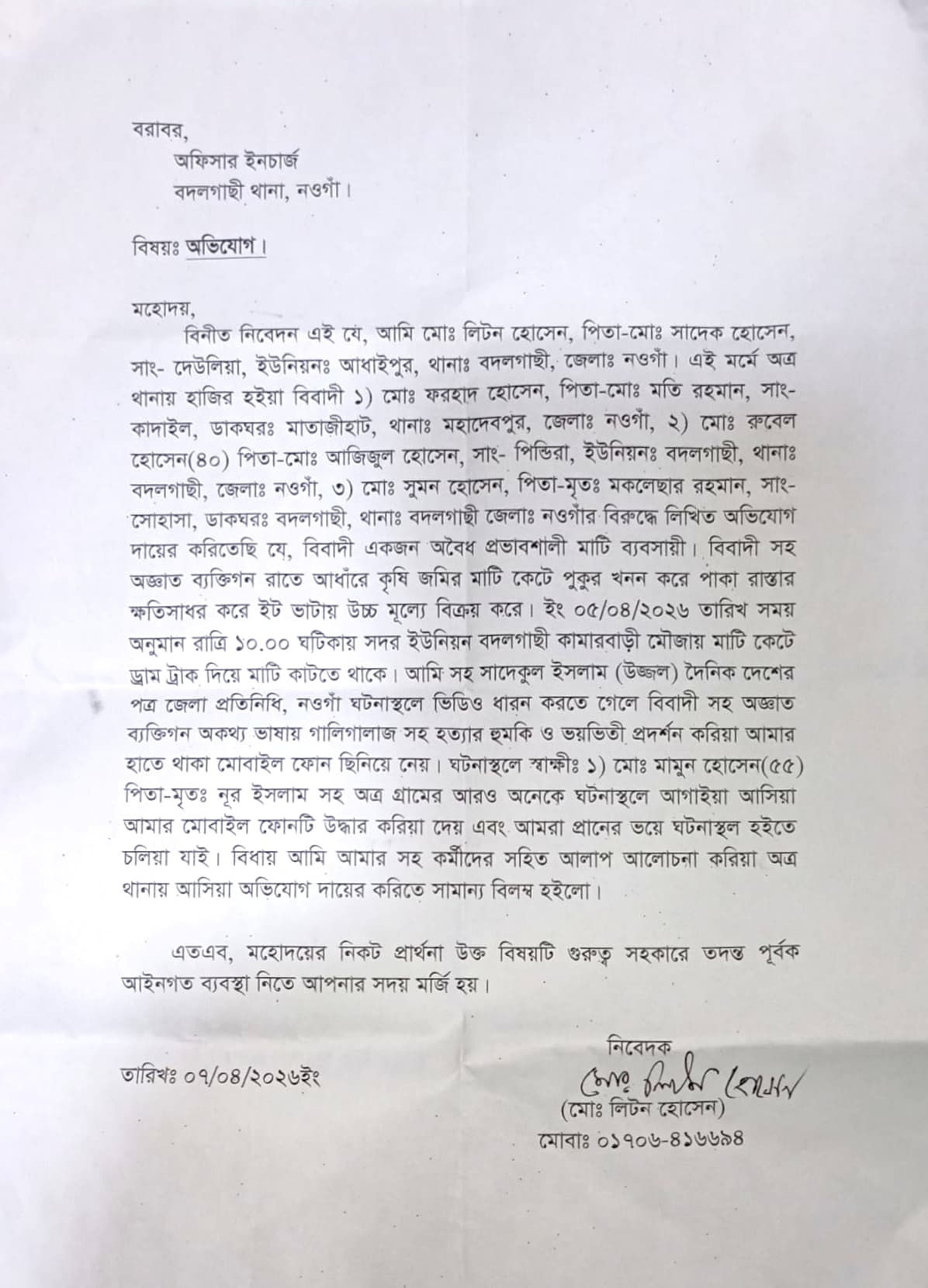 এ সময় সাংবাদিকদের কাছে থাকা পেশাগত কাজের সরঞ্জাম ও মোবাইল ফোন ছিনিয়ে নেওয়া হয়।পরে স্থানীয় গ্রামবাসী এগিয়ে এলে হামলাকারীরা ফোনটি ফেরত দিলেও তারা সাংবাদিকদের প্রাণনাশের হুমকি দিয়ে ঘটনাস্থল ত্যাগ করতে বাধ্য করে।এ ঘটনায় ভুক্তভোগী সাংবাদিক মোঃ লিটন হোসেন গত ৭ ই এপ্রিল বদলগাছী থানায় একটি লিখিত অভিযোগ দায়ের করেছেন।অভিযোগে তিনি অবৈধ মাটি ব্যবসায়ীদের দৌরাত্ম্য বন্ধ এবং তার ও তার সহকর্মীদের নিরাপত্তার দাবি জানিয়েছেন।